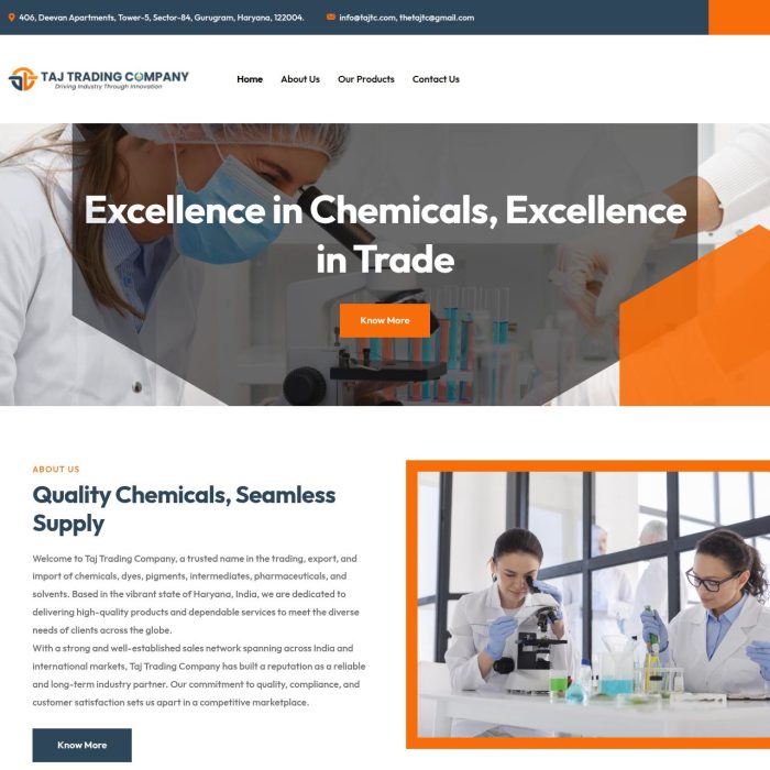 Taj Trading Company is a trusted and professionally managed organization engaged in the trading, import, and export of chemicals, dyes, pigments, intermediates, pharmaceuticals, and solvents.